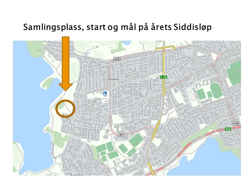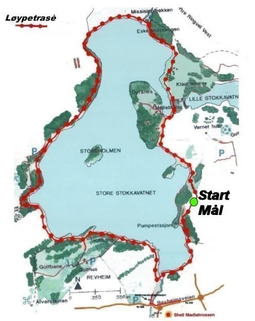 Kartet viser Stavanger vest hvor løypen går langs Store Stokkavatnet. Start- og målpunkt vises ved Sandal, på østre side av vatnet . Klikk full skjerm ikon øverst til høyre på kartet for større versjon og link under for å manøvrere deg til startområdet.